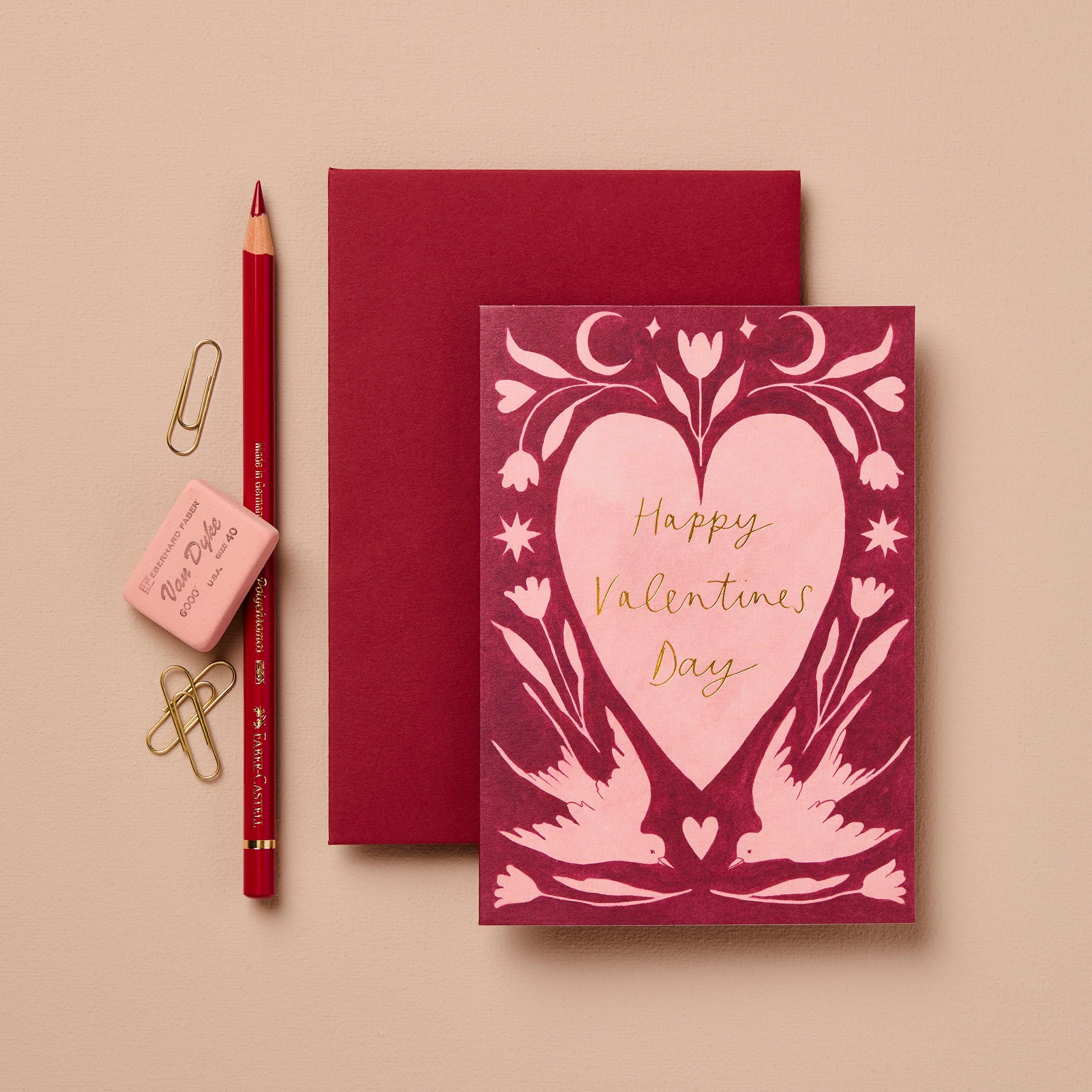A deep scarlet Valentines Day card in our new folk pattern, paired with a matching red envelope. As with all our cards, the design continues onto the back of the card, to make this a beautiful object rather than just a beautiful image.