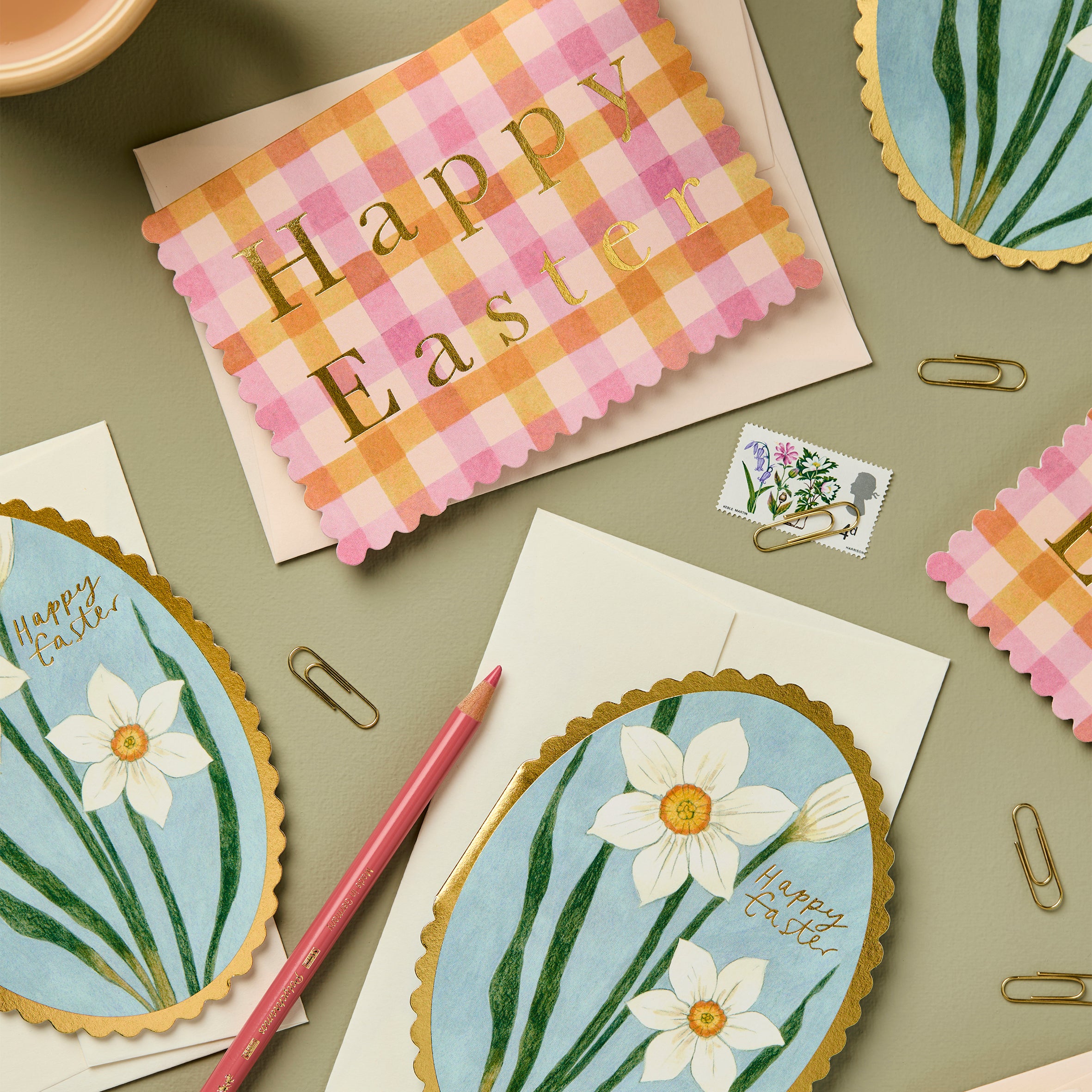 A pack of 6 Easter cards from our Spring 2026 collection, tied together with satin ribbon. Each card is printed with golden foil and has a die cut scalloped edge. This pack includes 3 of each design pictured (Narcissus 'Happy Easter' and Candy Gingham 'Happy Easter').