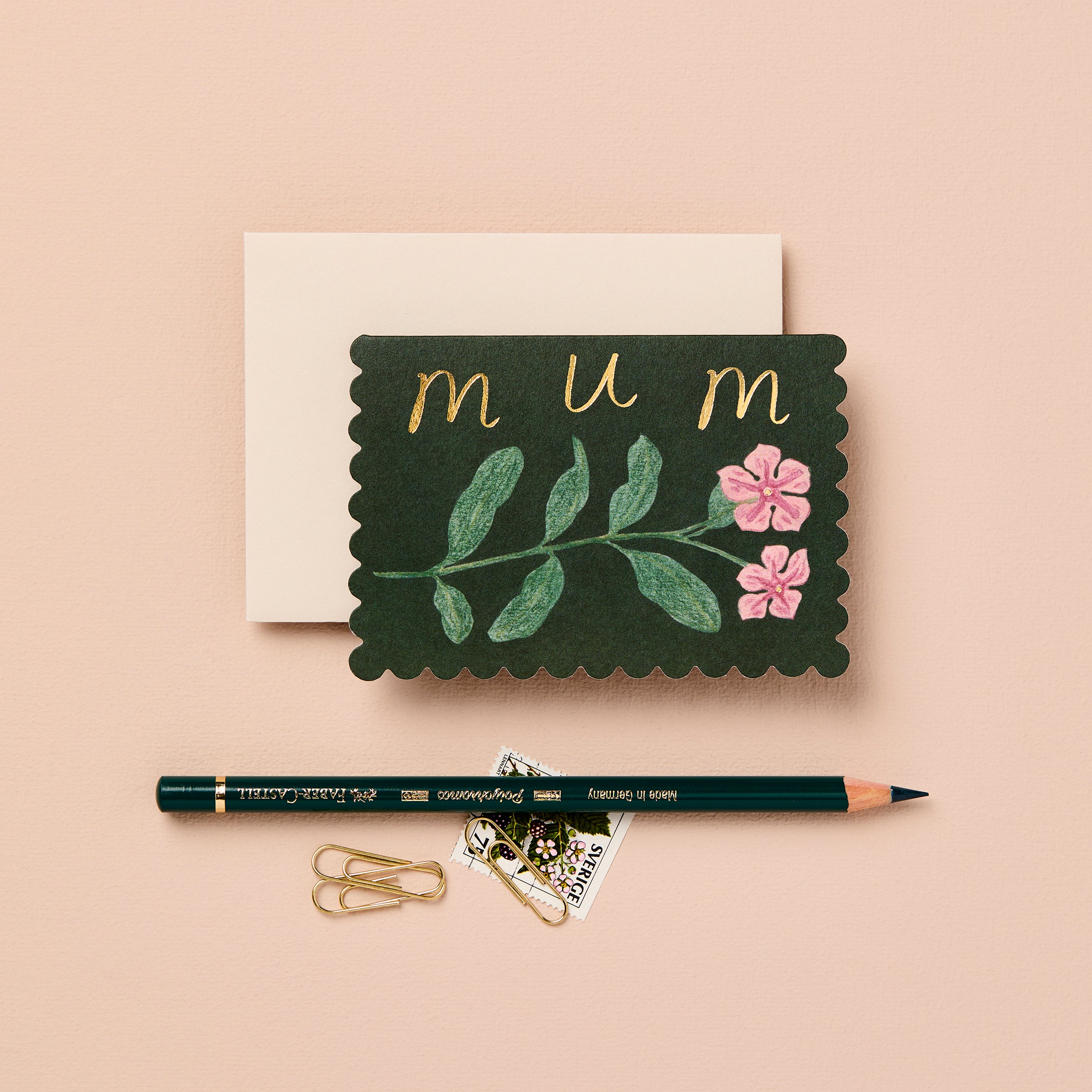 A mini card perfect for Mother's Day. This card has a deep green background, a gouache watercolour illustration, and scalloped edges. This card is paired with a pale grey C7 envelope.